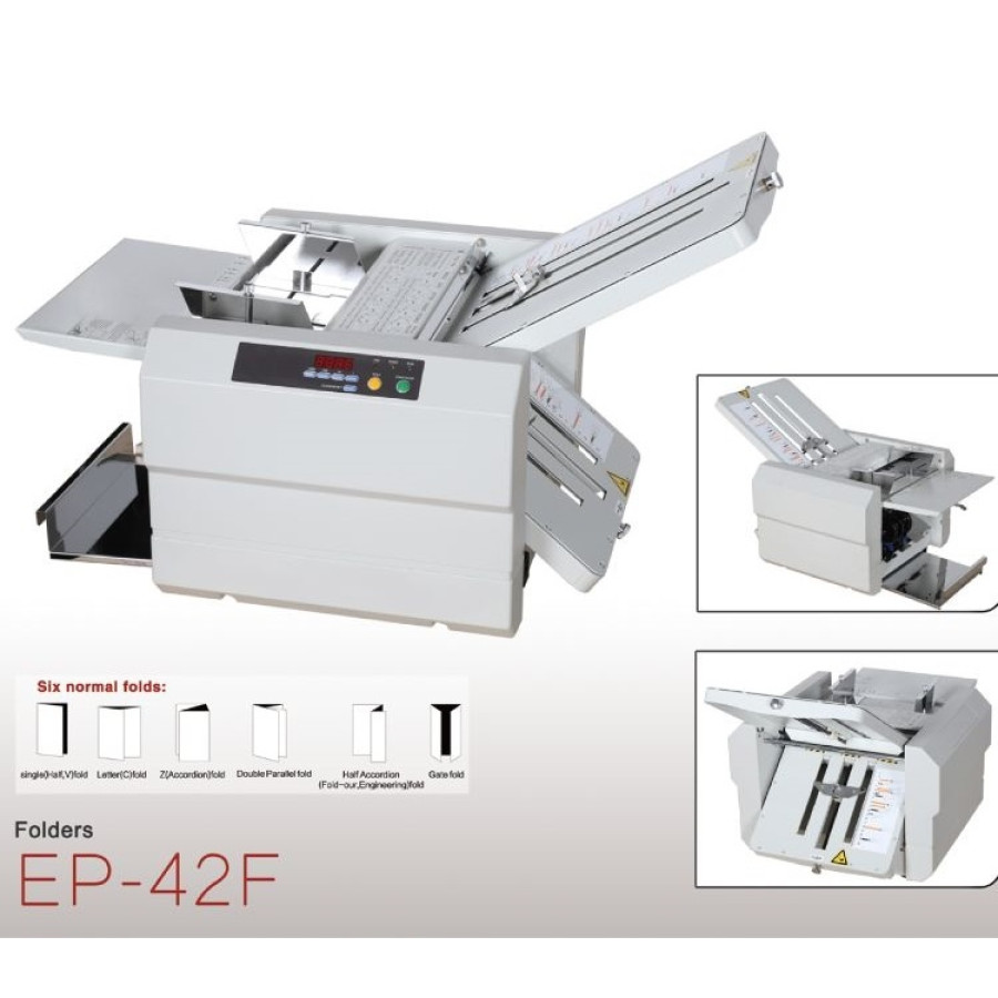 Машината за сгъване на хартия EP-42F A3 е здрава, висококачествена машина за сгъване на хартия. Тя е компактна, с възможност за шест стандартни сгъвания – от B6 до A3, както и персонализирани сгъвания.